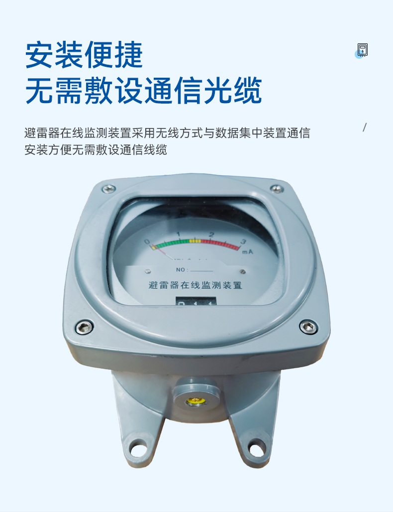 Ø 避雷器在线监测装置采用无线方式与数据集中装置通信,安装方便无需敷设通信线缆,无线方式电气隔离无安全隐患。