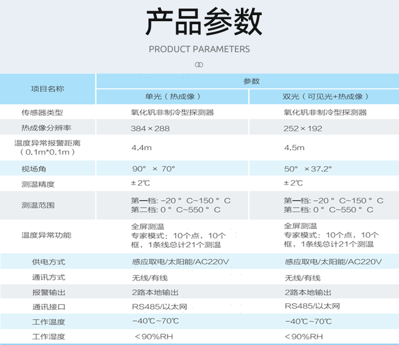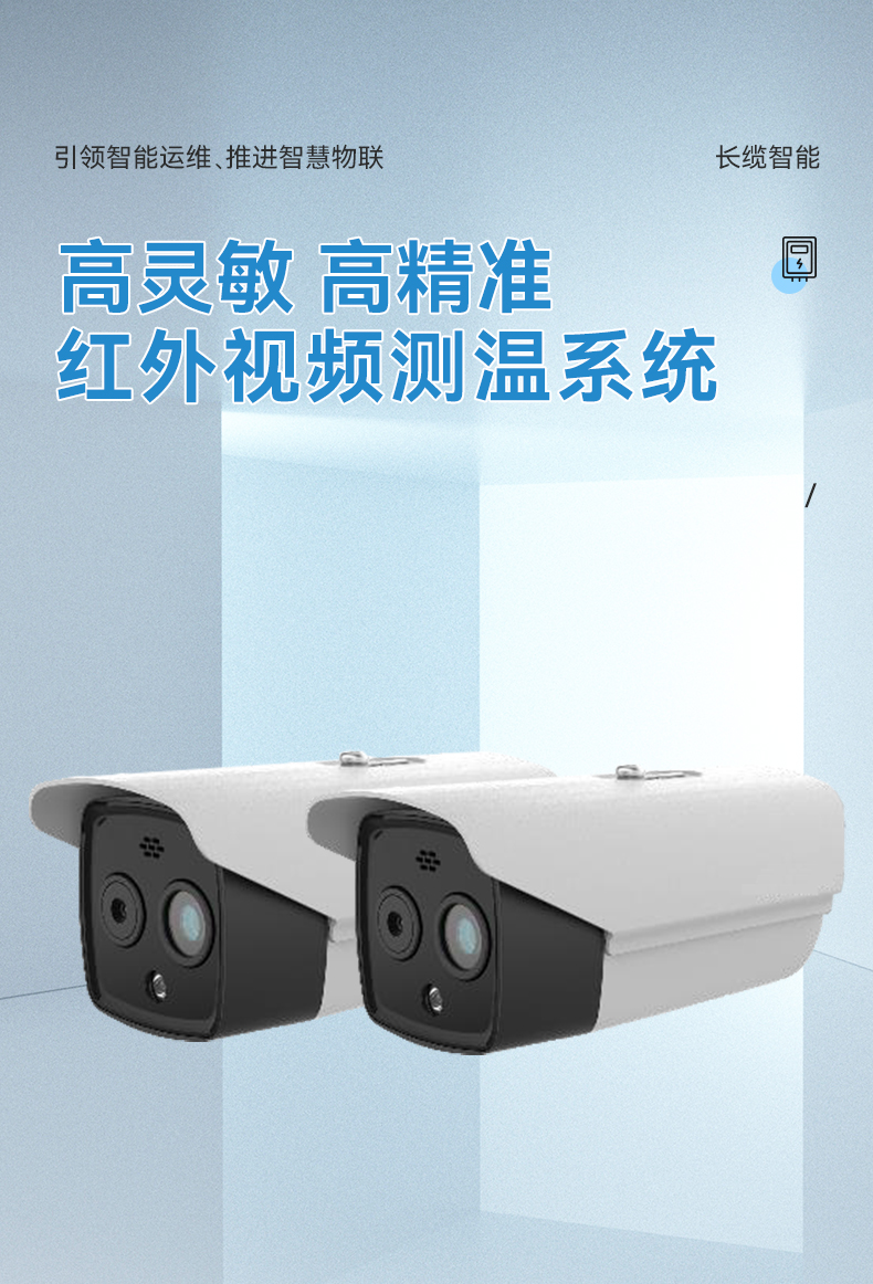 红外测温系统由红外测温摄像头及信号处理箱组成。其中红外测温摄像头采用非制冷型、高灵敏度探测器,并可同时支持可见光监测;信号处理箱包括对温度数据及测温图片的采集。系统支持无线、有线等通讯方式,并通过取能CT、太阳能、AC220V等方式对设备进行供电。