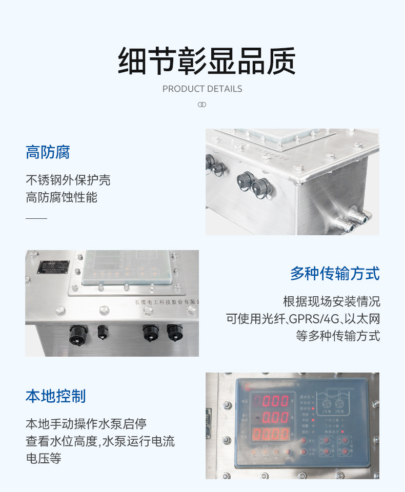 Ø 本地控制:本地手动操作水泵启停,查看水位高度,水泵运行电流、电压等。