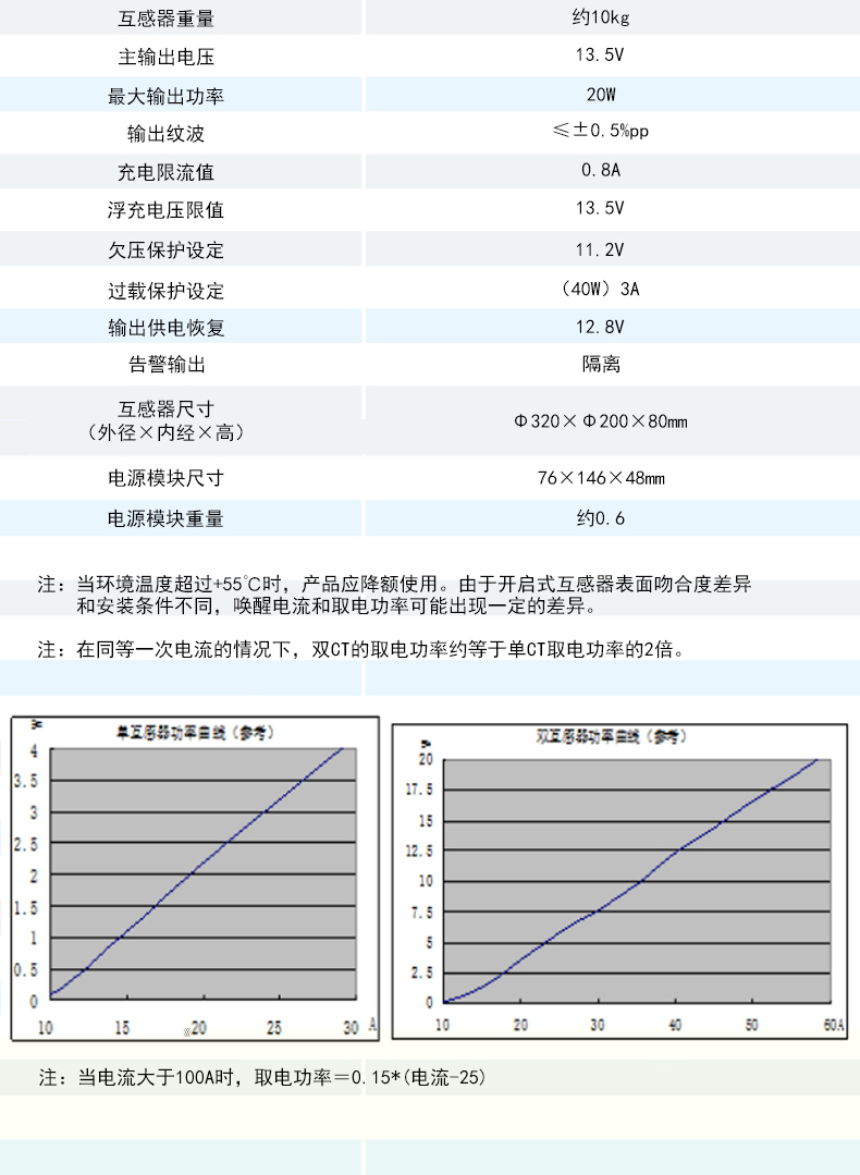 CT-20W-12是我公司针对电缆系统等环境中需要小功率电源的应用下,开发的一款带蓄电池充放电管理的高稳定性电流感应电源,其负载输出电压规格为12V,额定输出功率为20W,充电电压最大为13.5V,充电限流值为0.8A,充电最大功率为20W,支持取电的最大导线外径为200mm。该系列电流感应电源采用高频隔离DC/DC变换技术以及蓄电池充放电管理,辅以电源状态监视,配套专用取能互感器,体积小巧,电能转化效率高,满足了电网大电流冲击和负载跳变等多种恶劣情况下的安全供电要求。